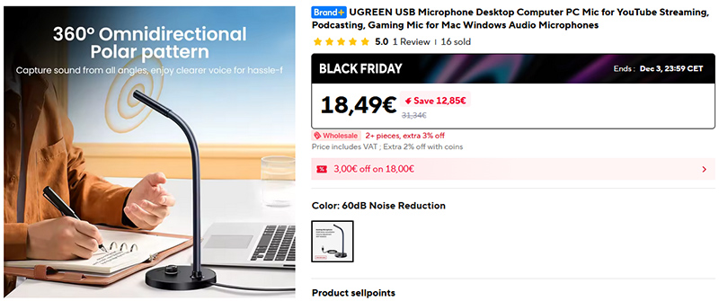 Десктопный микрофон UGREEN, подключаемый по USB. Активный шумодав 60 дБ, регулировка громкости, гибкая стойка. Микрофон такого рода дает заметно более хорошее качество голоса, чем встроенный микрофон веб-камеры.