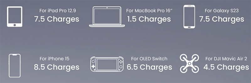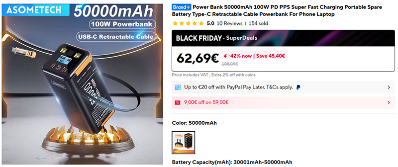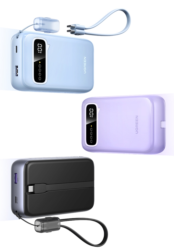 Мощный внешний аккумулятор с мощностью 100 Вт и рекордной емкостью 50000 мАч (185 Вт-ч). Поддержка 100W/65W/45W/35W/30W/27W/25W/20W/PD3.0 丨 QC4.0丨QC3.0丨PPS丨FCP丨SCP, четыре порта (USB-A 2x, Type-C 2х). Есть встроенный вытягивающийся кабель Type-C, дисплей, на котором показывается процесс зарядки через разные порты.