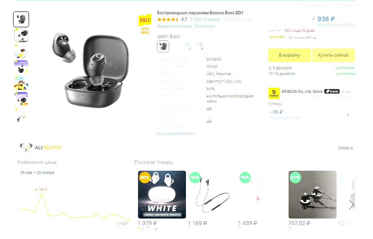 Беспроводные наушники Baseus Bass BD1за 936 руб. на AliExpress с купоном продавца.