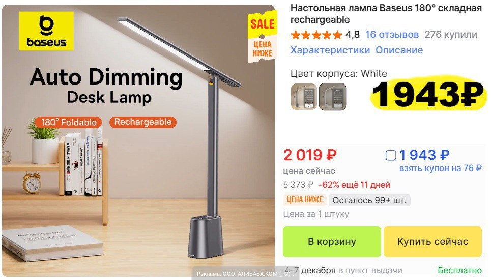 Настольная светодиодная лампа Baseus за 1943 руб. с купоном продавца на AliExpress.