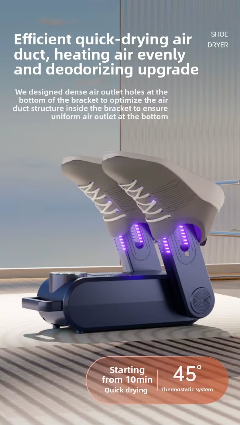 Компактная и быстрая. LED дисплей. Легкий выбор температурного режима. Обдув обуви 360º. Можно добавить ароматизатор. Обработка ультрафиолетом. Подходит для сушки всех видов обуви - от сапог до мокасин, также можно сушить носки.