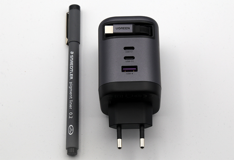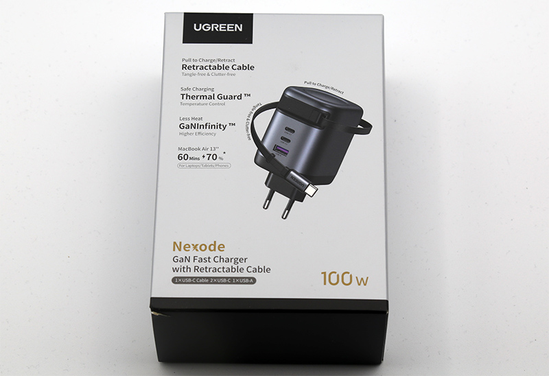 Еще одно устройство от компании UGREEN топовой серии Nexode - GaN-адаптер питания мощностью 100 Вт. Встроенный разматывающийся кабель Type-C длиной 75 см, еще два порта Type-C и порт USB-A. Встроенный кабель и верхний порт Type-C - мощность 100 Вт, второй порт Type-C - 30 Вт, порт USB-A - 22,5 Вт. Одновременно может заряжать до четырех устройств, включая ноутбук. MacBook Pro 14" от этого адаптера с нуля набирает 54% заряда за 30 минут. Все виды защиты: от высокого напряжения, от короткого замыкания, от пониженного напряжения, от перегрузки по току, защита от перегрева и перегрузки по мощности. По ссылке есть также более дешевые модификации этого адаптера - на 65 Вт и 45 Вт, они также имеют встроенный кабель и еще два порта.