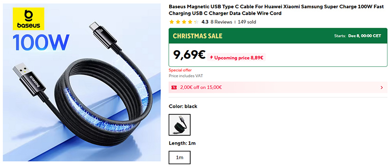 Магнитный кабель Baseus USB-A - Type-C, который хранится с сложенном виде, при необходимости разматывается, а потом легко складывается обратно. Поддерживает мощность до 100 Вт.