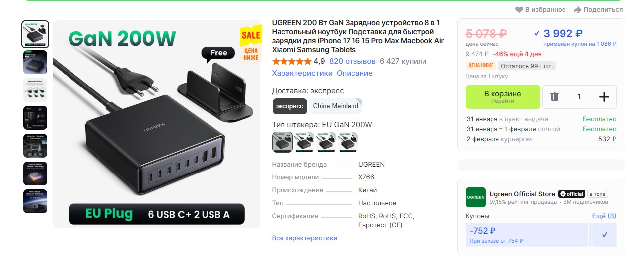 Если вы в машине часто ездите не один, и пассажирам, как и вам, нужно подзаряжать свои смартфоны - вот продвинутый зарядный адаптер Asometech аж "5 в 1" мощностью 78 Вт с удлинителем. Поддержка быстрой зарядки PD 3.0 QC 3.0 SCP, три порта USB-A мощностью 30, 30 и 18 Вт, два порта Type-C мощностью 30 Вт. Зарядит, короче говоря, всё и даже больше. Плюс есть дисплей, на котором показывается вольтаж зарядки.