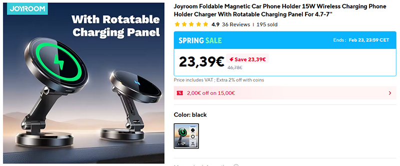 Очень популярный автомобильный держатель для смартфона Joyroom с беспроводной магнитной зарядкой MagSafe. Надежно крепится к торпедо или к стеклу, положение смартфона настраивается. Мощность беспроводной зарядки - 15 Вт.