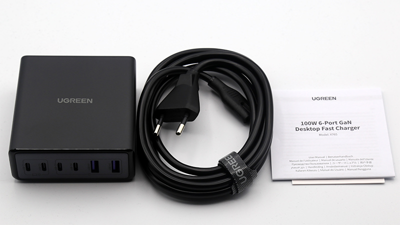 Мощный настольный GaN-адаптер UGREEN: 6 портов (два USB-A, четыре Type-C), общая мощность 100 Вт, мощность порта для питания ноутбука - 65 Вт. Адаптер подключается к розетке двухметровым кабелем.