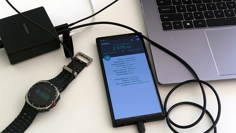 А вот он у меня одновременно питает и заряжает ноутбук, смартфон и часы. Очень удобно.
