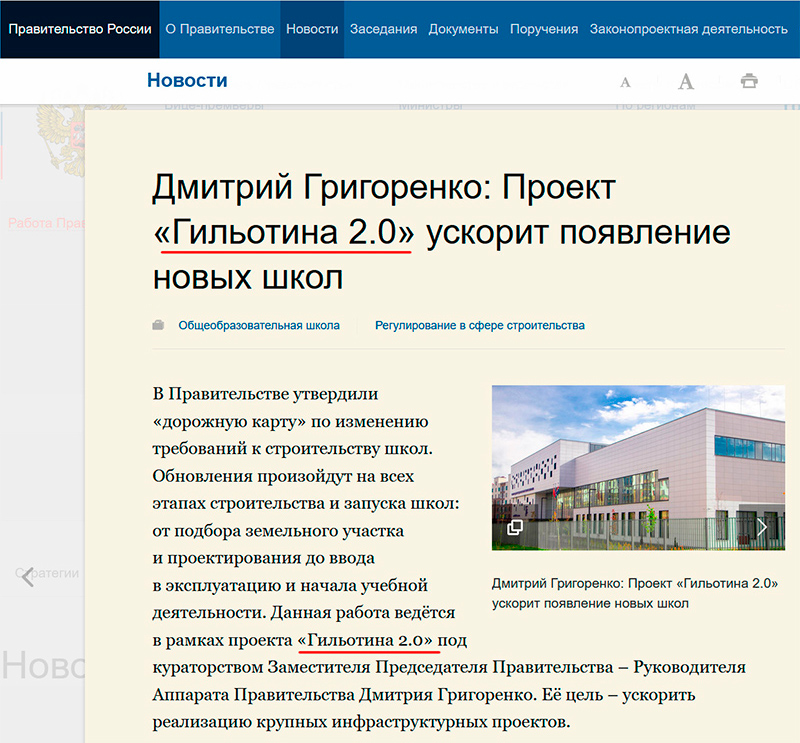 Когда мне это прислали, я подумал, что наверняка "Фотошоп", не может быть. Но вот, пожалуйста, на сайте правительства. То есть эти прекрасные люди совершенно серьезно назвали проект расширения школ - "Гильотина 2.0". Я не буду спрашивать, что у них в головах. Потому что я боюсь услышать ответ.
