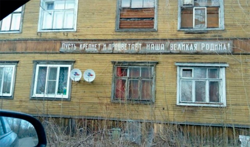 Почему-то подобные идиотские лозунги чаще всего размещаются на совершенно жутких строениях. Нет ли здесь какого-то коварного умысла?