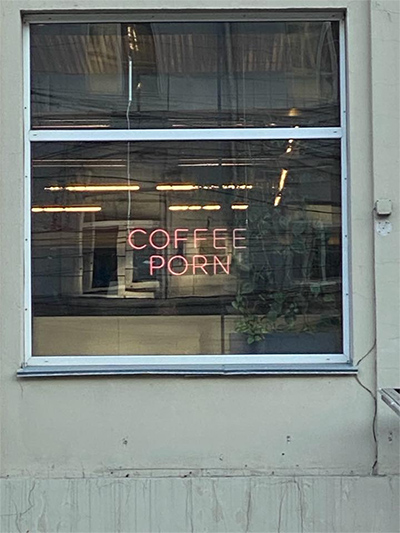 Слово "porn", в принципе, может использоваться и в переносном смысле, для описания какого-нибудь из ряда вон выходяшего явления или чего-то гипертрофированного, экзотического. Например, в UK есть такое понятие как "property porn" (когда дро#ат на дорогую недвижимость). Или было одно громкое судебное дело, за которым следила вся страна - так его называли "legal porn". Так почему бы не быть и "coffee porn" - может там у них столько сортов кофе, что просто заходишь и о#уеваешь.