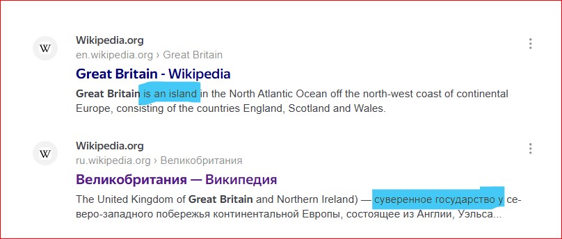 Ну ок. Рядом две Википедии. В русской Great Britain - это государство, столица - Лондон.
