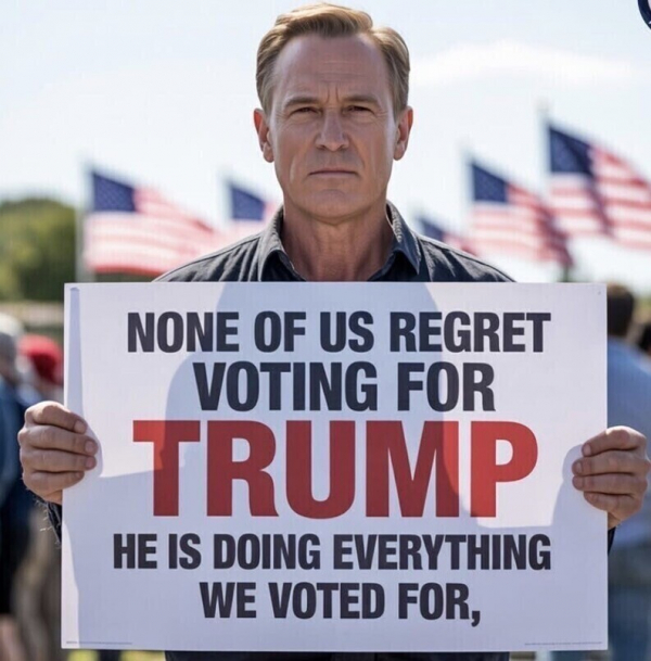 Суровый американ говорит, что ни один из них, суровых американов, не жалеет о том, что они голосовали за Трампа, потому что тот всегда делает то, за что они голосовали, но фраза оборвана. Мы заинтригованы. Там по смыслу дальше должно следовать ", но...".