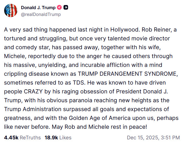 Вчера вечером в Голливуде произошло очень печальное событие. Роб Рейнер, мучившийся и борющийся, но когда-то очень талантливый кинорежиссер и звезда комедий, скончался вместе со своей женой Мишель, по сообщениям, из-за гнева, который он вызывал у других своим массивным, неуступчивым и неизлечимым страданием от болезни, известной как СИНДРОМ ПОМЕШАТЕЛЬСТВА НА ТРАМПЕ, иногда называемый TDS. Он был известен тем, что сводил людей с ума своей яростной одержимостью президентом Дональдом Дж. Трампом, причем его явная паранойя достигла новых высот, когда администрация Трампа превзошла все цели и ожидания величия, и наступил Золотой век Америки, возможно, как никогда раньше. Пусть Роб и Мишель покоятся с миром!