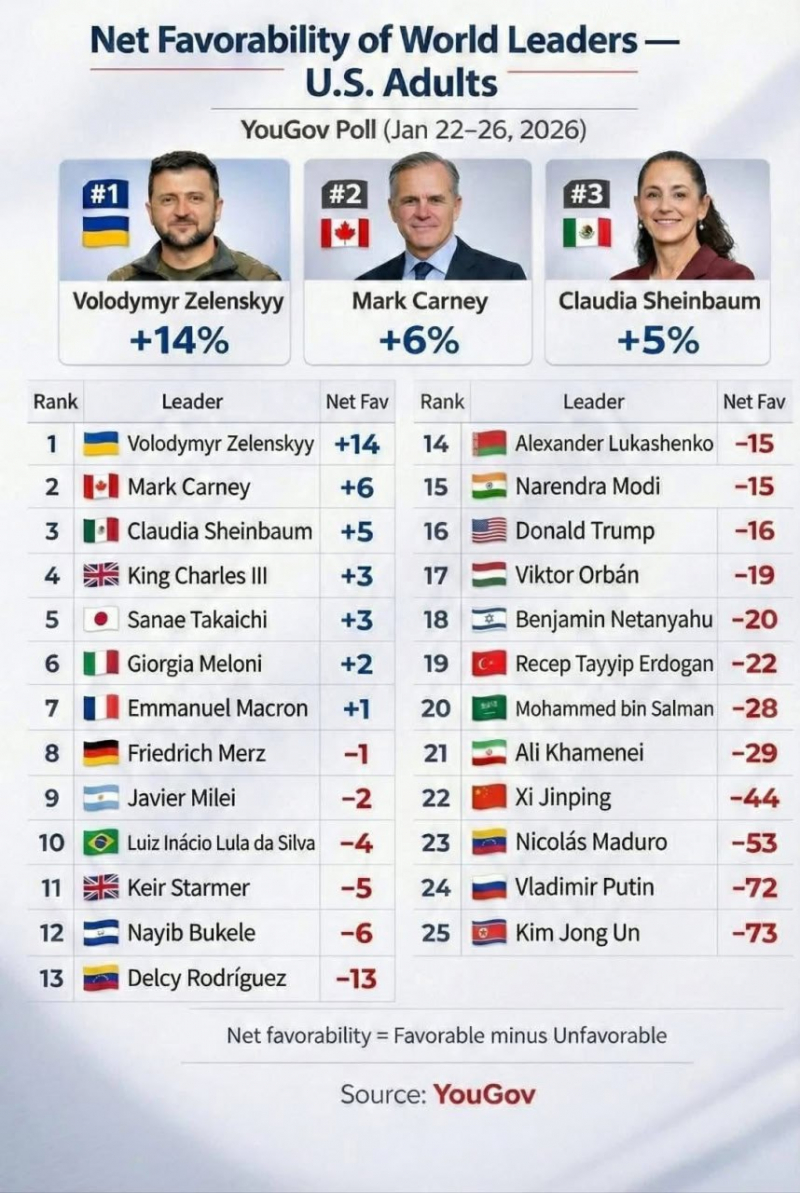 Служба YouGov опубликовала результаты январских опросов об отношении американцев к мировым лидерам. Было опрошено 2274 человека. Вот здесь в PDF подробные результаты, общие результаты сведены в табличку.