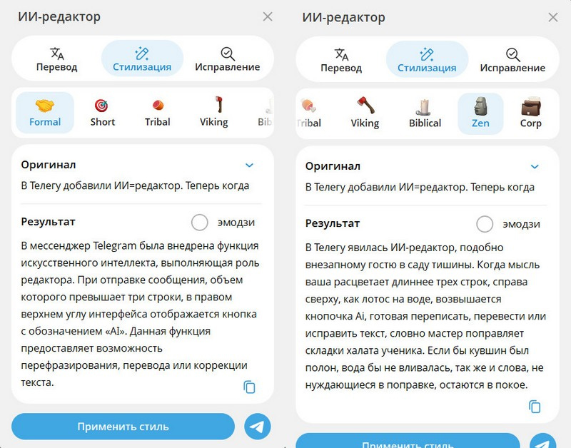 В Телегу добавили ИИ=редактор. Теперь когда вы пишете сообщение длиннее трех строк, справа сверху появляется кнопочка Ai, с помощью которой можно переписать, перевести или исправить текст.