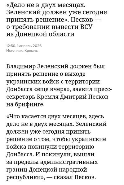 Песков визжит, что Украина должна без боя отдать территорию Донбасса, которую Путин не смог захватить и, судя по всему, в обозримом будущем захватить так и не сможет.