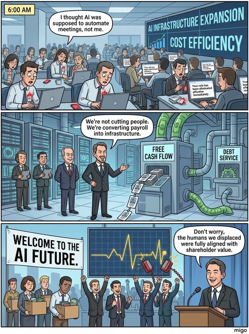 "Добро пожаловать в будущее ИИ" на фоне графика роста акций. Директор радуется: "Не волнуйтесь, мы полностью выровнены со стоимостью для акционеров". Финальный сарказм: увольнения радуют инвесторов, а долг маскируется под инновации.