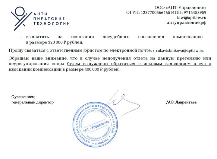 Потрясающе, мне пришло письмо с требованием выплатить штраф в размере 320 000 рублей за то что я в своей статье на Дзене использовал фоту, взятую из Интеренета якобы с нарушением авторским прав от фирмы «антипиратские технологии» по требованию фотографа Французова Дениса. Какая именно фотография нарушает авторские права не указано, только ссылка на мою статью про памирские народы.Я удалил вообще все чужие фото от греха подальше, а дальше выяснилось самое интересное. Что фирму на самом деле не интересует удаление фото и соблюдение прав, ее интересует только заработок. Эта мошенническая схема поставлена на поток, при том что юридически к ней не придраться.В сети набирает популярность новая схема заработка на защите авторских прав, с помощью которой компании выбивают огромные штрафы за якобы неправомерное использование фотографий. В сфере заработка на авторском праве чаще всего звучит имя Александра Лаврентьева, который является совладельцем компании «Антипиратские технологии». Известно, что в прошлом году Лаврентьев стал крупнейшим истцом в отрасли авторского права.Как следует из материалов Forbes, в 2022 году прибыль «Антипиратских технологий» по утверждениям самой компании составила 25 миллионов рублей при выручке в 50 миллионов. В 2023 году Лаврентьев заявил о цели выручить 80-100 миллионов.И это при том, что государство российское неустанно печется как бы народ защитить от мошенников, просто потрясающе. За фоту из Интеренета 320 тыщ!