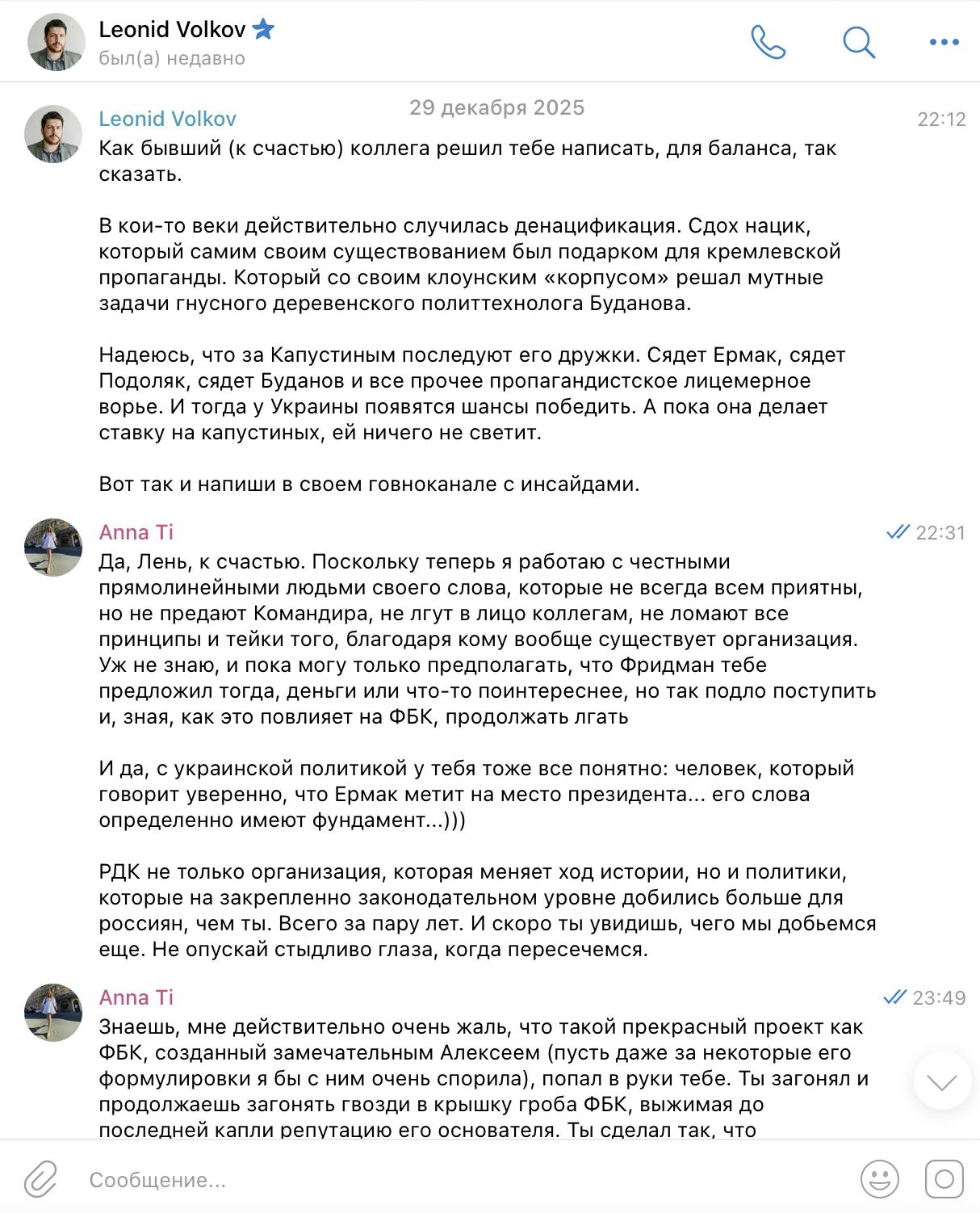 Эту переписку в своем FB опубликовала бывшая сотрудница ФБК Anna Tiron, которая сейчас сотрудничает с РДК. И она там дала развернутый комментарий по поводу этого Волкова. Мы о нем, в общем-то, это все знали, также мы знаем, в какую конкретную помойку превратился ФБК после смерти Навального, но интересен взгляд бывшей сотрудницы.