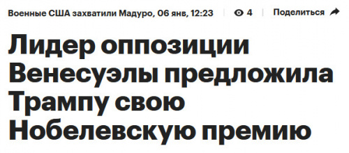 Пошел почитать оригинал. А в нем, как я и ожидал, вообще ничего не говорится о том, что Мачадо "предложила Трампу свою Нобелевскую премию". Известно, что, получив Нобелевскую премию, Мачадо посвятила ее Трампу, чтобы тот не слишком разорялся.