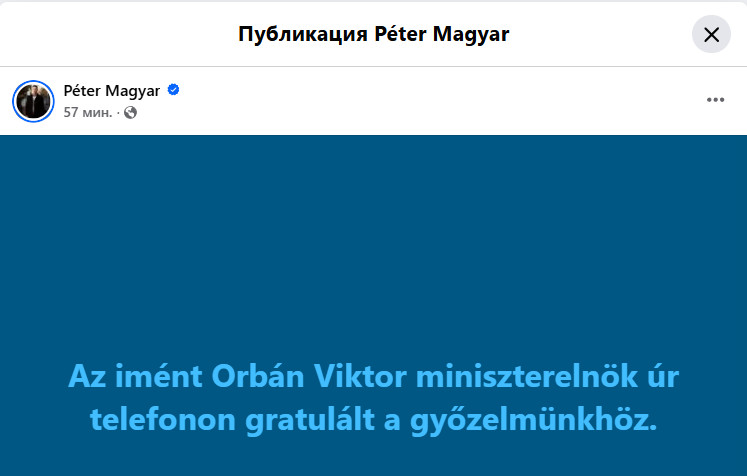 Лидер «Тисы» Петр Мадьяр сообщил на своей странице в Facebook, что Орбан уже поздравил его с победой по телефону.