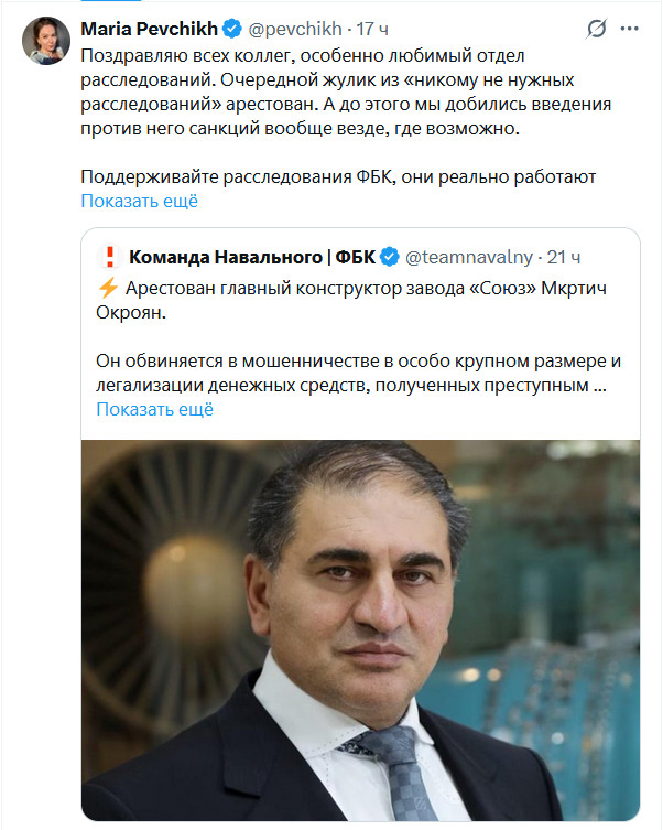 Поздравляем Фонд Борьбы с Коррупцией с блестящей победой! Благодаря неустанной работе любимого Певчих отдела расследований, они добились того, что главный конструктор завода "Союз", ведущего российского предприятия по разработке и сопровождению двигателей для самолётов, вертолётов и ракет, был арестован! Понимаете, он же воровал в особо крупных размерах, из-за чего завод не выпустил много двигателей для самолетов, вертолетов и ракет.