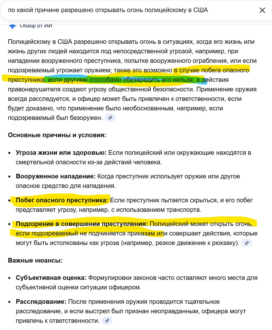 Показательно другое - как быстро власти, что местные, что трамповские бросились защищать агента или наоборот. Обязанность властей - гарантировать порядок, гасить конфликты. Имхо, было бы вполне нормально если бы сразу же заявили "мы не можем выносить суждения без официального расследования, любая потеря жизни трагична. Приносим соболезнования семье погибшей". Насколько же я вижу, вместо этого сразу же было заявлено "агент действовал в целях самозащиты, идите нафиг". Имхо, это чистой воды сознательное разжигание вражды в обществе.