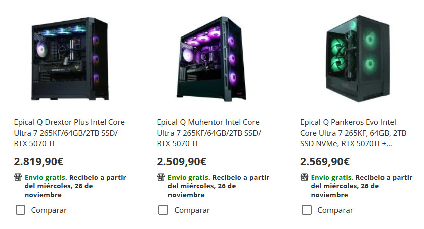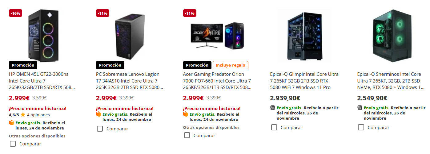 Мужик у них заказал настольный ПК в сборе на платформе Intel Core Ultra 7 256K, 32 ГБ памяти и видеокартой GeForce RTX 5080. Другие параметры он не приводит. Заплатил он за эту конфигурацию €2099 (купил со скидкой в Черную пятницу). Ну и что-то как-то, даже учитывая скидку, он больно мало заплатил, потому что подобная конфигурация там стоит порядка €2550-3000 - вон сверху скриншот всех предложений.