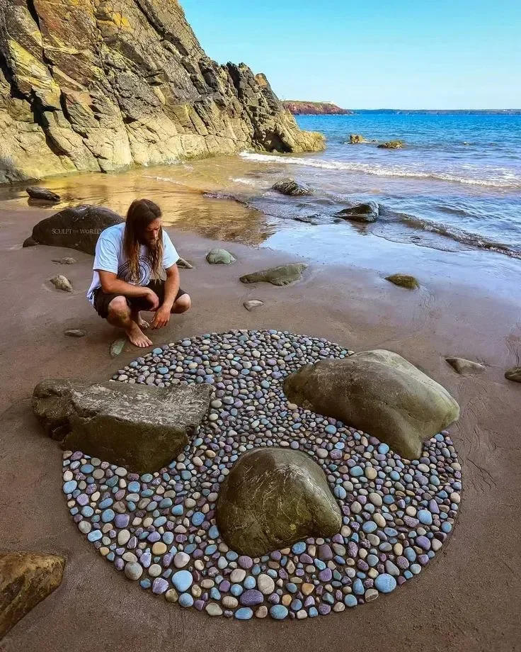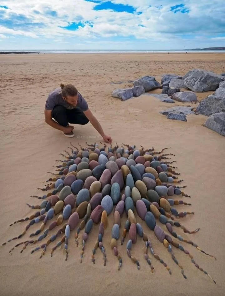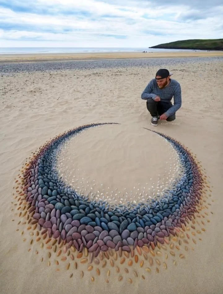 Свои композиции он создает в прибрежной зоне залива в округе Уэльс. Больше всего он любит работать с камнями (он сам их окрашивает в определенные цвета) и ракушками, и его композиции привлекают туристов.