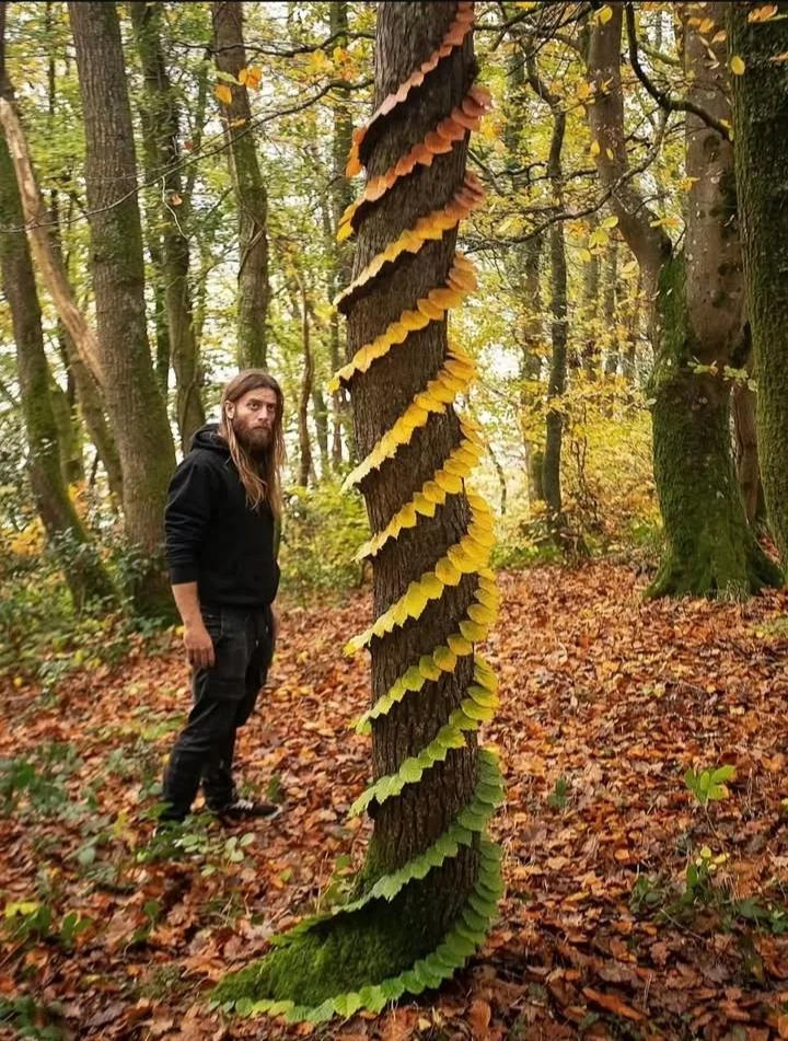А как он листья на стволе дерева укреплял, интересно?