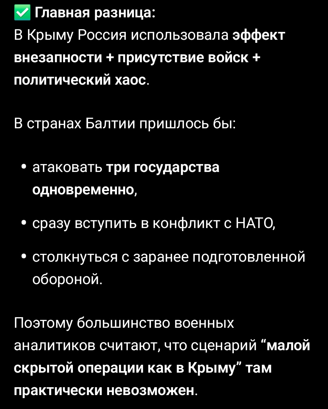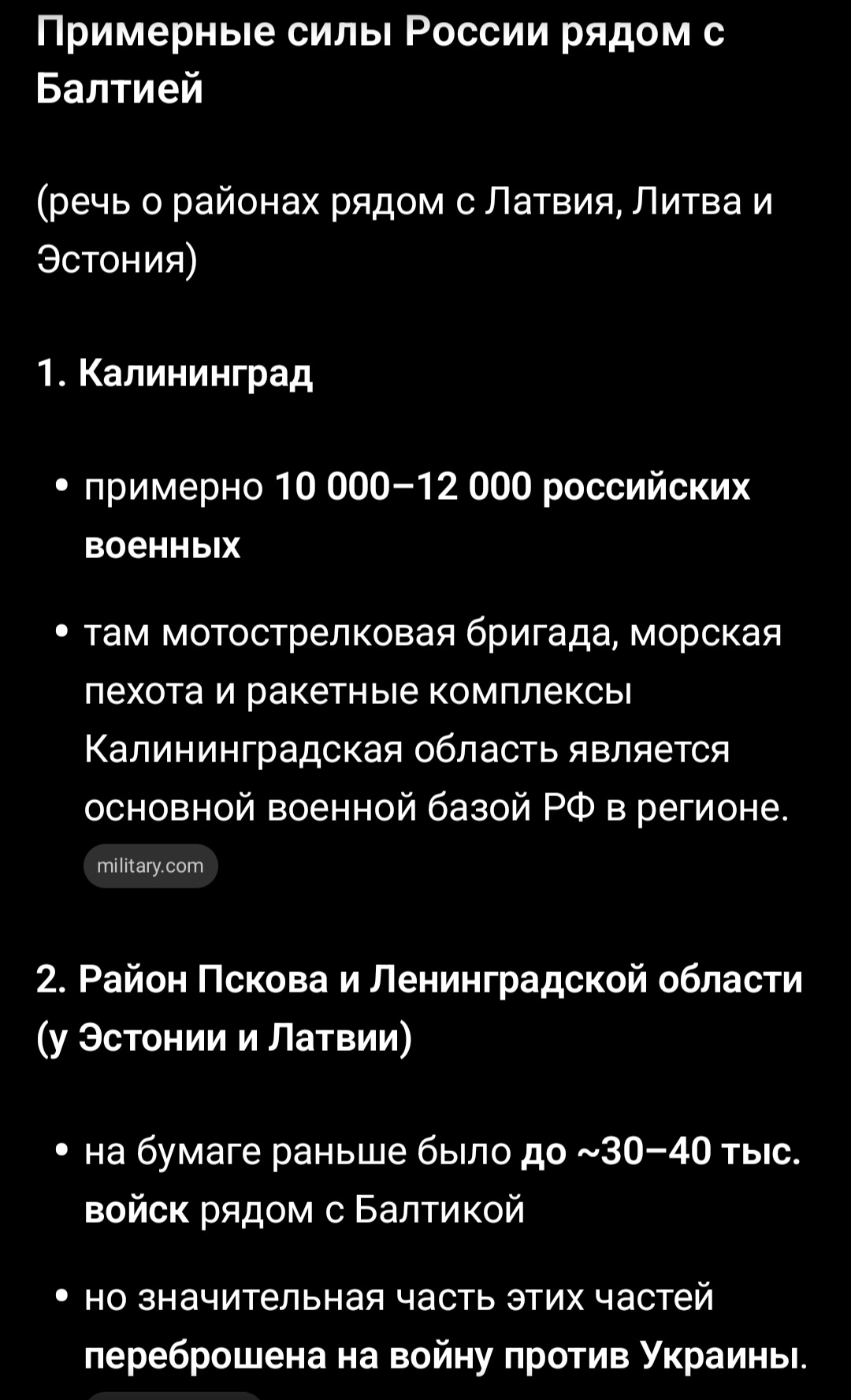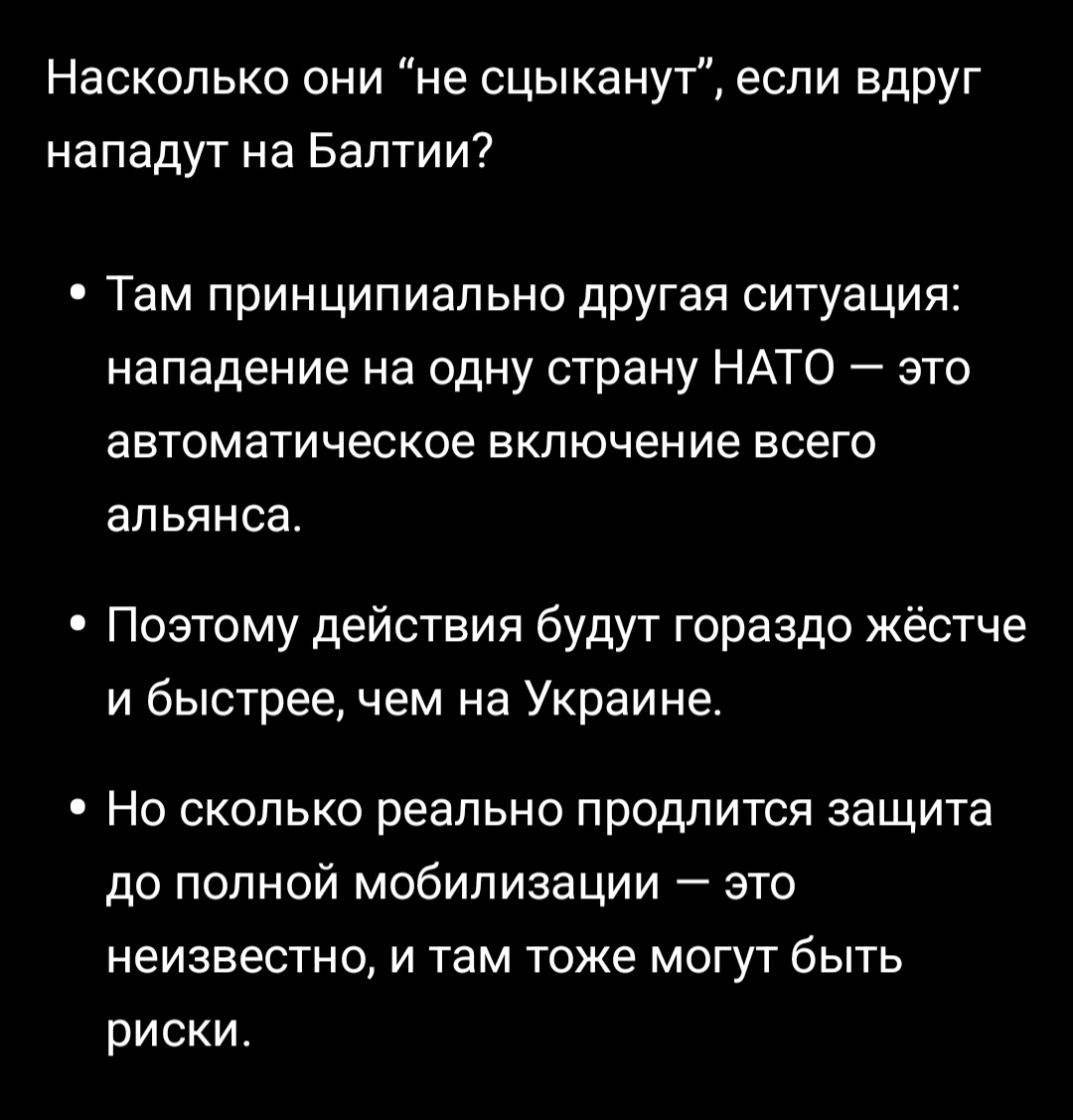 Митрич считает, что сейчас вероятность нападения РФ на страны Балтии - резко возросла. В принципе, доводы он приводит вполне разумные. Но я совершенно не понимаю, какими именно силами Путин собирается нападать на страны Балтии, если его "вторая армия мира" пятый год по полгода берет какие-то украинские села. Там даже по операции ВСУ в Курской области было хорошо видно, что у Путина нет ресурсов, чтобы этому серьезно противостоять. Сколько ВСУ были в Курской области - полгода? Ну и какие страны Балтии? Нет, в Тиктоке-то бравые тиктокерские войска всю Европу захватят, нет вопросов. Но только там.