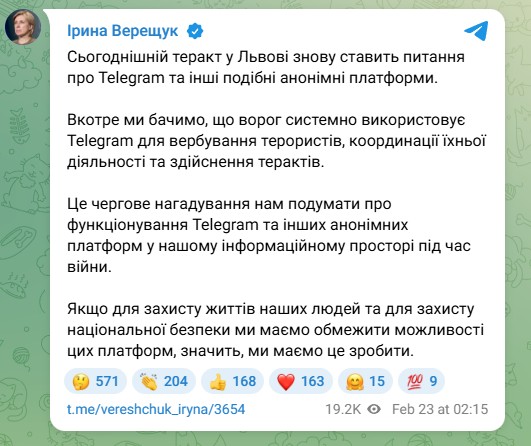Дурочка верещук предлагает заблокировать телеграм с своём телеграме.Русский телеграм, который принадлежит русскому агенту Дурову. От всего русского надо избавляться, но без спешки, разумно.П. С. "Тупорылая Рада Слуг Народа" - наводит на определенные мысли 😃