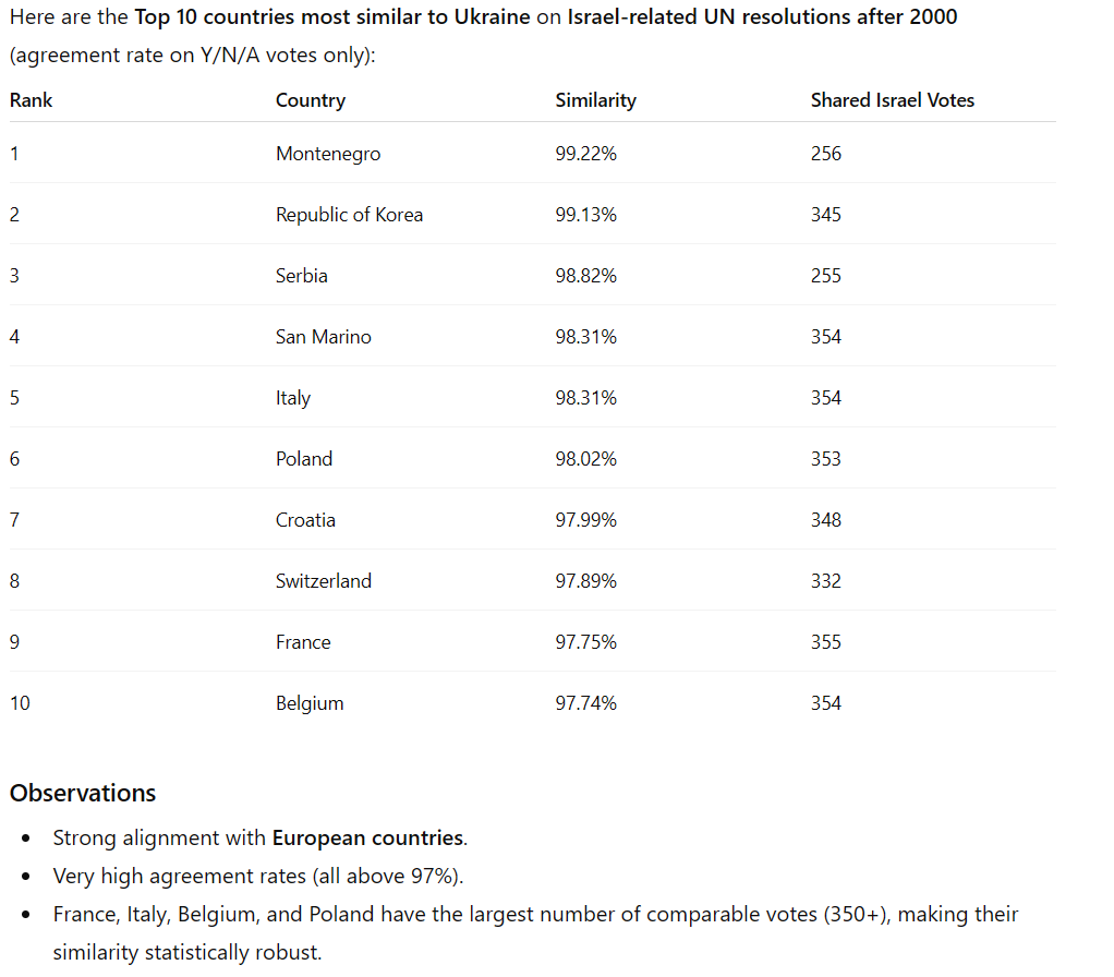 Украина проголосовала против Израиля в 95 резолюциях и воздержалась в 27 из них. Онв ни разу не проголосовала за Израиль