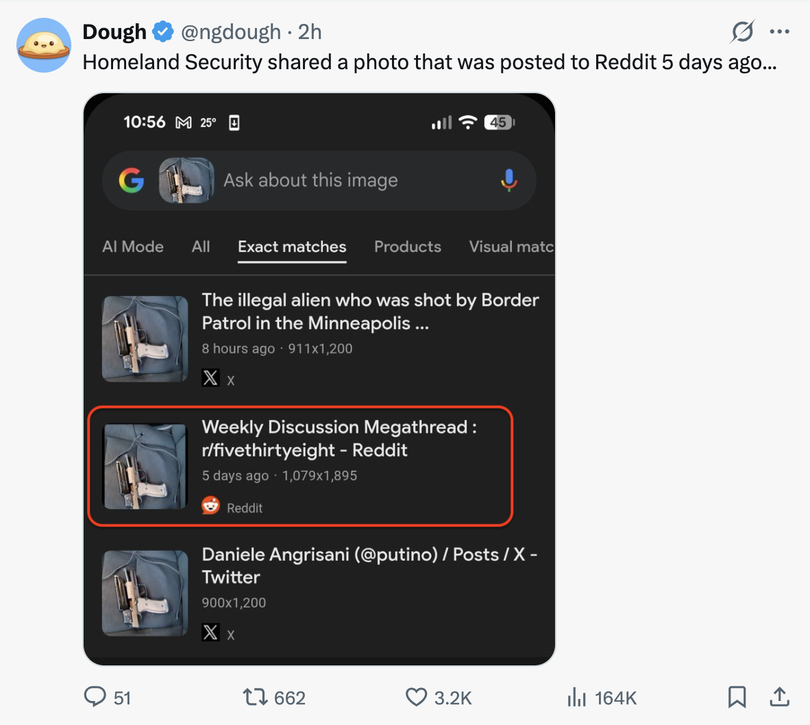 В министерстве внутренней безопасности США заявили, что погибший был вооружен. Представитель министерства также предоставил фотографию пистолета, который, как утверждается, был у мужчины. Других подробностей в министерстве не привели.