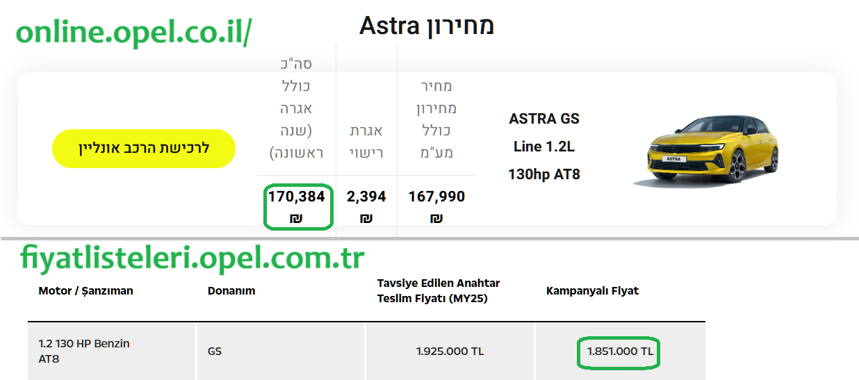Поэтому сравнил цены на Астры в Израиле и Турции, данные с официальных сайтов: