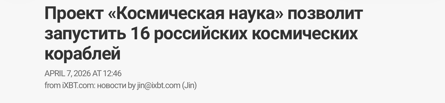 Но несколько дней назад ситуация резко изменилась. Новости про автомобили исчезли, вообще исчезли. Но в огромном количестве вместо них появились "новости" про космос в РФ- про будущие лунные станции, про космические ядерные реакторы, про российские открытия квазаров и т.д. Я наскринил заголовки только за сегодня что быстро нашёл.
