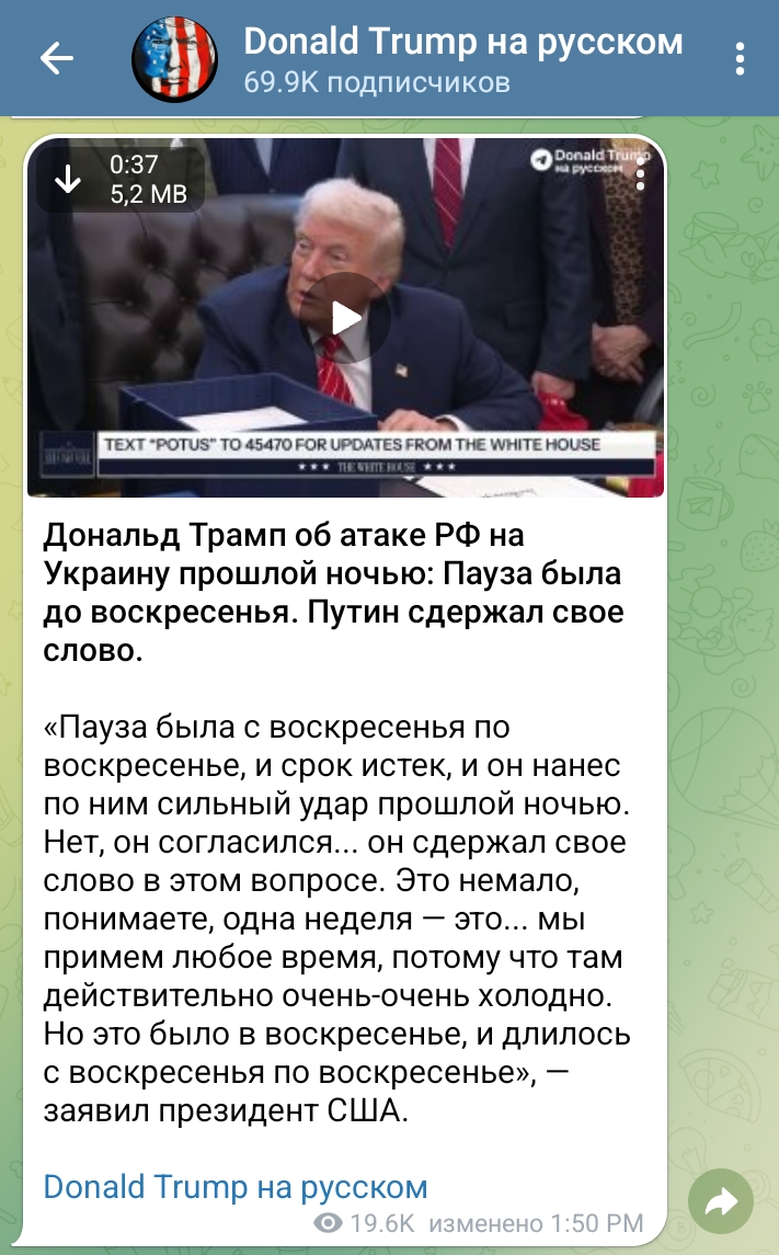 «Пауза была с воскресенья по воскресенье, и срок истек, и он нанес по ним сильный удар прошлой ночью. Нет, он согласился... он сдержал свое слово в этом вопросе. Это немало, понимаете, одна неделя — это... мы примем любое время, потому что там действительно очень-очень холодно. Но это было в воскресенье, и длилось с воскресенья по воскресенье», — заявил президент США."