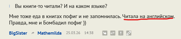 И я не говорила, что еда - важная тема. Разговор был о том, что все было мрачно, с редкими просветами, между которыми приятные моменты были весьма блеклыми. Да и их порезали в фильмах.