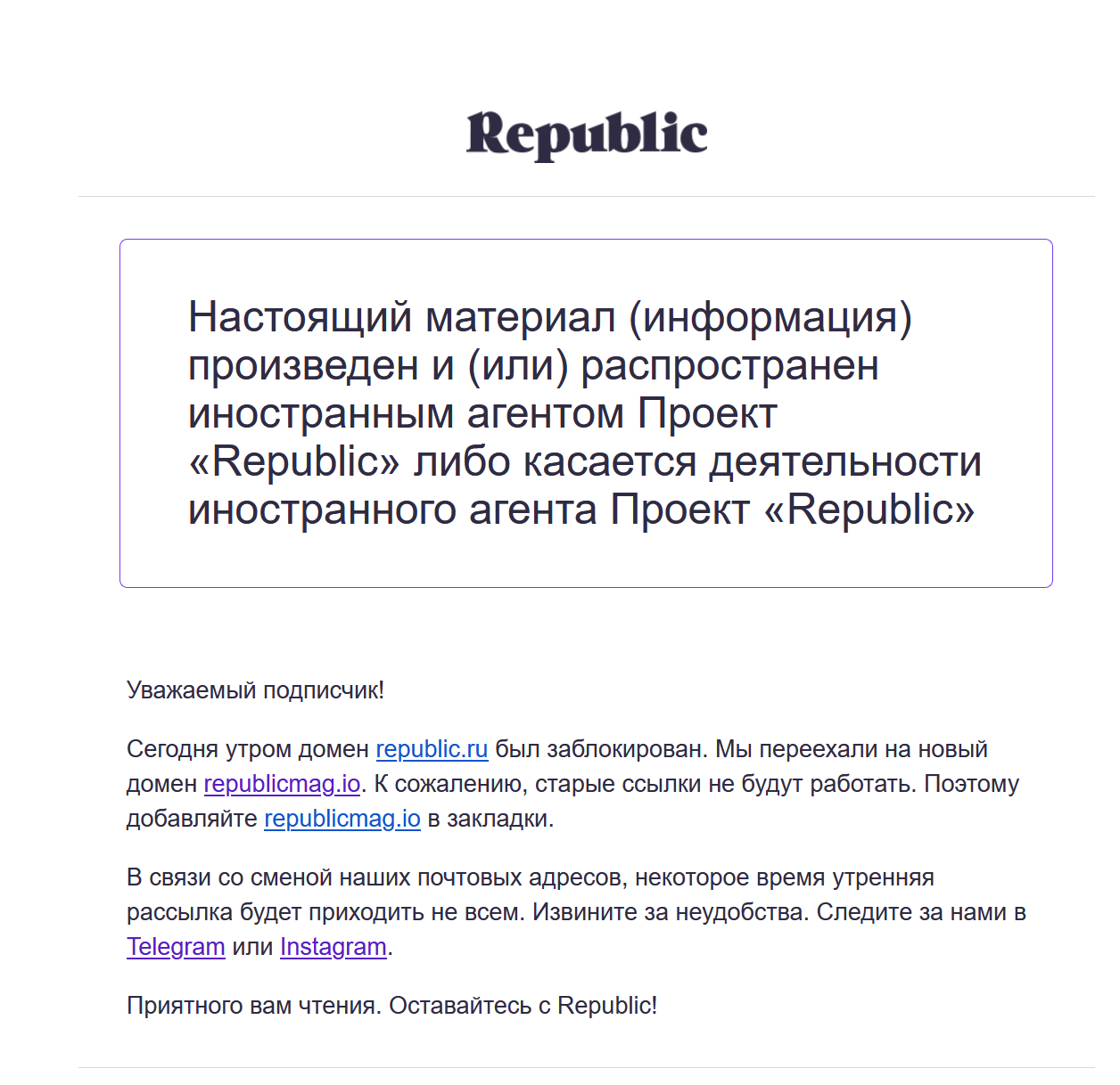 Роскомнадзор начал во внесудебной порядке изымать интернет-домены в зоне .ru, не дожидаясь протаскивания через Думу соответствующего законопроекта. Об этом The Moscow Times стало известно из извещения российского регистратора доменных имен «РЕГ.РУ» о прекращении делегирования домена www.mоscowtimes․ru. О разделигировании регистратором домена republic ru также сообщило сегодня издание Republic.