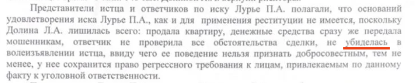 Но это совершенно не важно в данном случае. Суд посчитал что Долина подписала договор находясь под давлением, и на основании этого принял решение о изъятии (!) квартиры. Заметьте это не признание ничтожности, а именно изъятие недвижимости в пользу Долиной. Совершенно дикое решение.