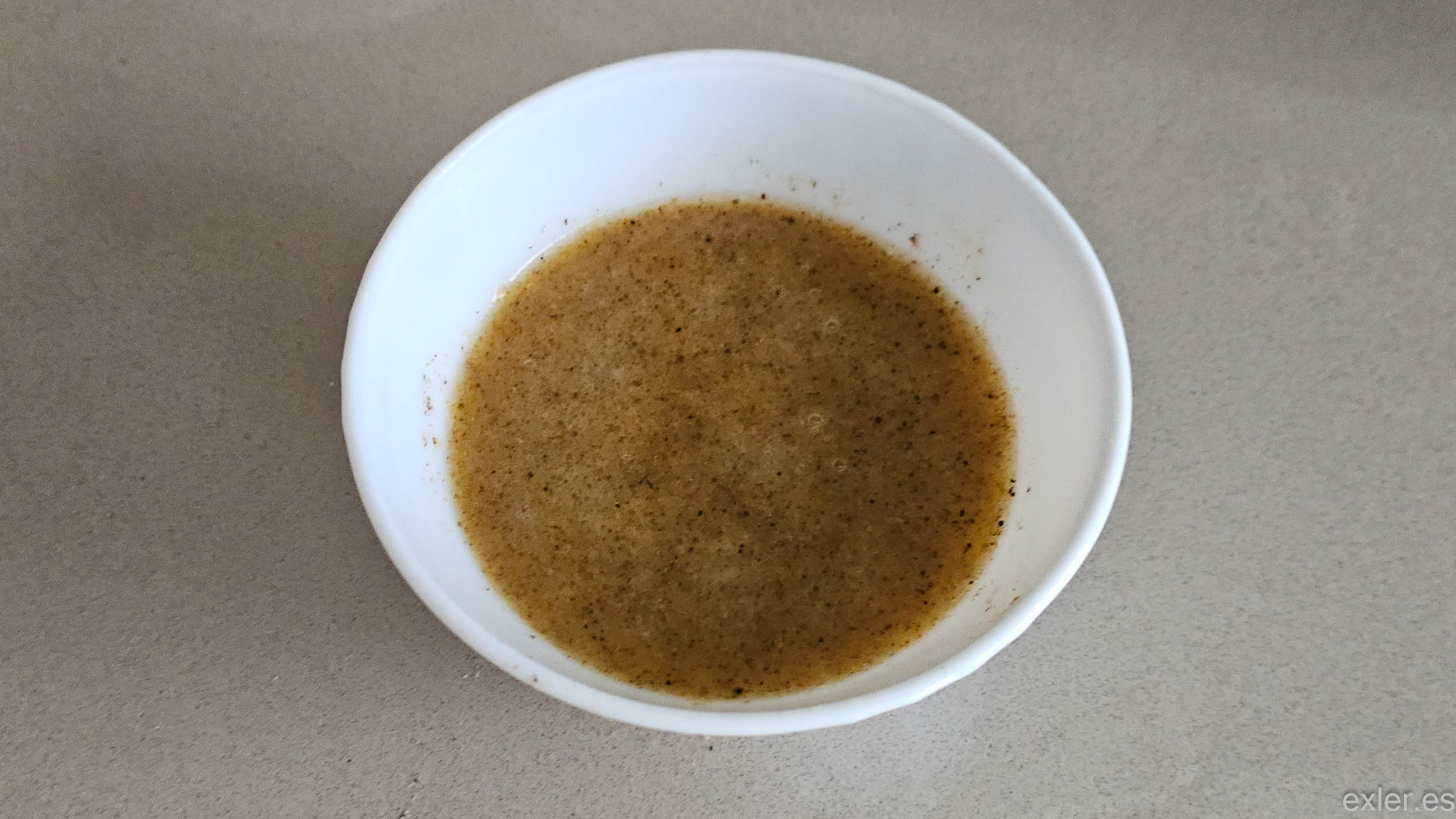 А нам уже пора ставить курицу готовиться. Соус из пакета/емкости нужно слить в плошку, он еще пригодится. Готовить будем на решетке аэрогриля 20 минут или решетке духовки на 180 верхний-нижний нагрев - это минут на 40-60 до достижения курицей температуры в 75 градусов. В процессе приготовления рекомендуют периодически поливать курицу оставшимся соусом - я поливаю, но только один раз, где-то в середине запекания.
