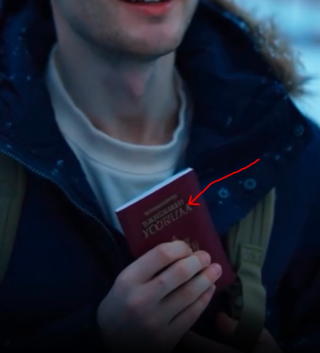 И там много очень трогательных деталей. Сначала молодой человек стоит перед вывеской "Россия" и там один пейзаж. Когда его типа как впускают, там уже совсем другой пейзаж - видимо, он отдаляется от России-матери. Также интересно то, что пограничник сначала один, а потом показывают, как молодой человек стоит спиной к пограничнику и обращается, видимо, уже к другому пограничнику. Которого там нет.