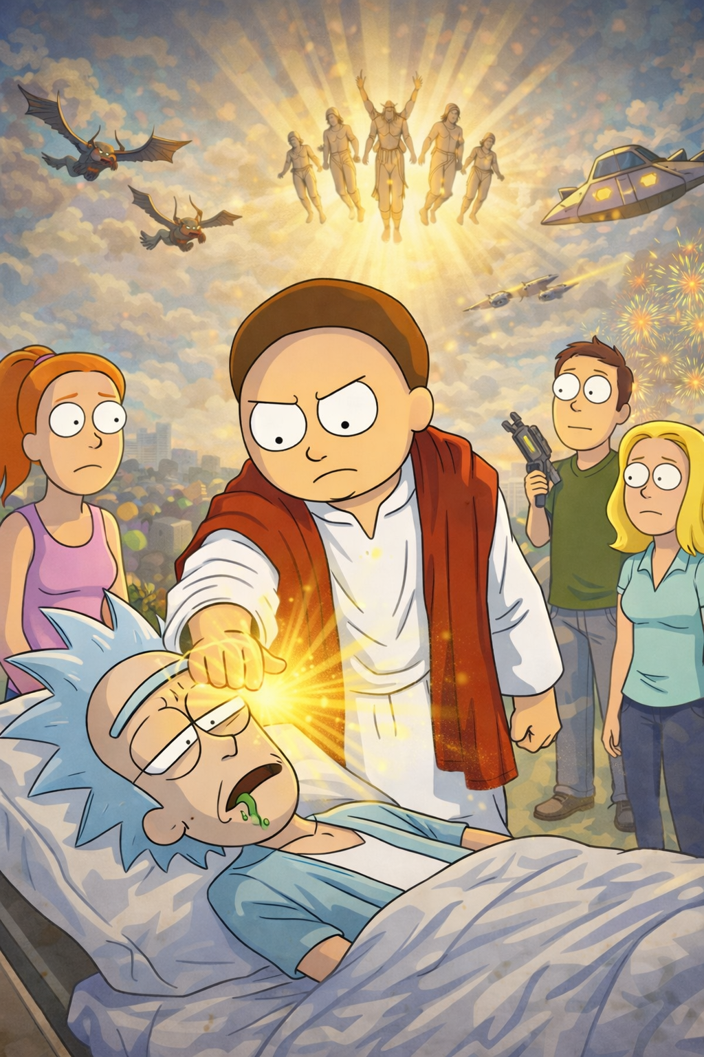 Мое предположение: на картинке - текущий лидер Ирана - Моджтаба Хаменеи. Основания: во первых, он, как говорят, как раз сейчас находится без сознания, так что наверняка лежит на какой-нибудь кровати, окруженный медсестрами. Кроме того, у него есть борода. Так что тут все сходится. Картина изображает как Трамп посылает ему мысленные сигналы, чтобы тот наконец очнулся, потому что нужен же кто-то, чтобы с этим кем-то договариваться! Вверху нарисовано сообщение, которое Трамп транслирует в голову Хаменеи - мол, если завтра не очнешься, я пошлю своих морпехов и даже одного назгула (это, вероятно, то самое секретное оружие Трампа, о котором он говорил).