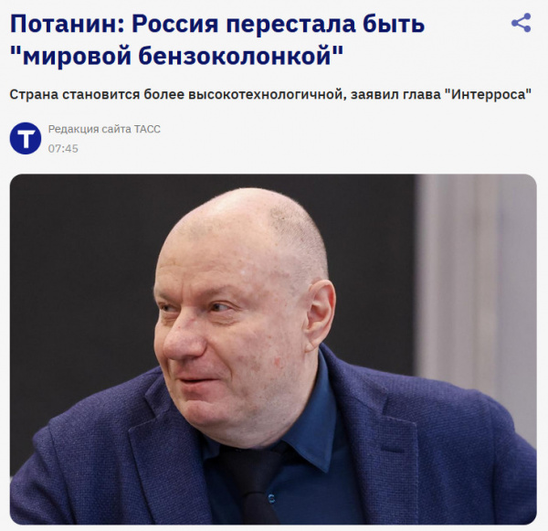 Потанин говорит чистую правду. Россия действительно перестала быть мировой бензоколонкой и стала китайской бензоколонкой. И еще индийской бензоколонкой.
