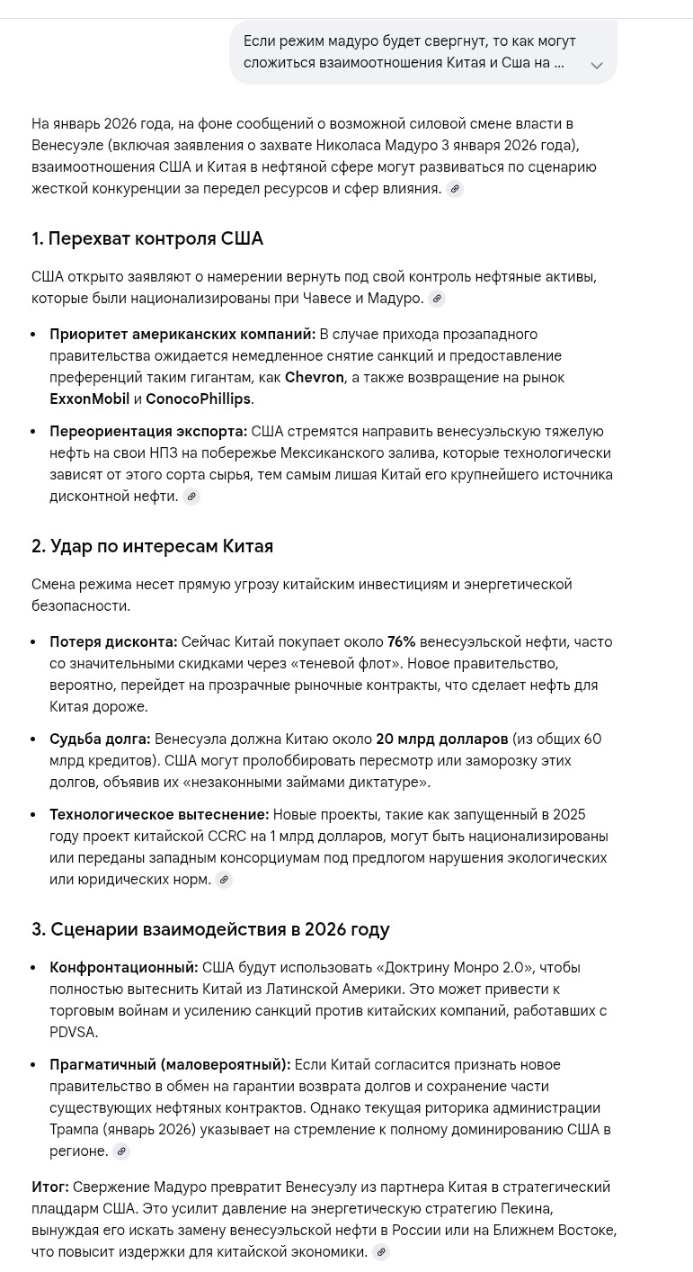 Вот по этому это плохо:"Решения по поводу того, как дальше будет жить Венесуэла и кто будет управлять страной, будут принимать власти США, заявил Трамп.«Мы не можем рисковать, позволяя кому-то другому управлять и просто завладевать тем, что он [Мадуро] оставил», — пояснил президент США."