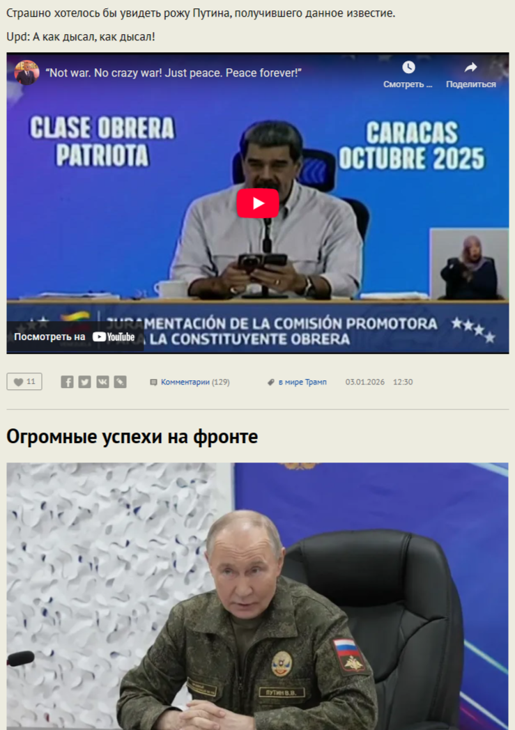 Всем кто тут утверждает, что США поступили плохо и якобы нарушили какие-то там международные нормы, выкрав преступника и диктатора Мадуро с целью предания его суду. Скажите, разве есть хоть один человек, которого можно считать человеком, который не мечтал бы, чтобы наконец-то также сделали с путиным, с целью предания его международному суду за все его преступления, или хотя бы чтобы его удавили в своей резиденции? Почему для вас арест Мадуро - это плохо, если арест такого же, только более крупного, опасного и кровавого преступника путина - это хорошо и общее благо?