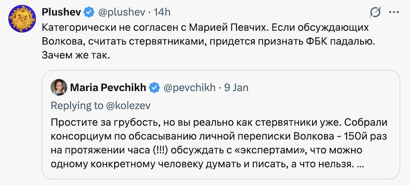 Милов также говорит о том, что "коллеги из ФБК проведут над этим работу", но тут, извините, уже 5 дней прошло с момента публикации Анны Тирон этой переписки, подлинность которой подтвердил сам Волков, а что у нас там по поводу этих потрясающих заявлений их руководителя сказали в ФБК? Ничего не сказали, ноль. Где там эта всегда такая активная Певчих, которая по любому поводу в кожанке и с маузером залезает на броневик? Нет ее, сгинула куда-то, молчит. За все это время только одна какая-то маленькая (в смысле должности) сотрудница ФБК робко написала, что она не понимает, почему руководство молчит по этому поводу - Саша Плющев ее пост цитировал в своем ТГ. И всё!