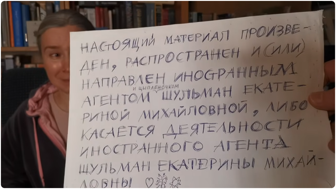Дело против Шульман возбудили из-за публикации летом 2024 года без «иноагентской» плашки одного видео в ютубе и трех постов в Teletype — сервисе для монетизации контента, через который она оформляет посты в телеграме. Политологу вменили видео, опубликованное на ее ютуб-канале 3 августа, — при этом выложенный там в этот день ролик предваряется плашкой «иноагента».