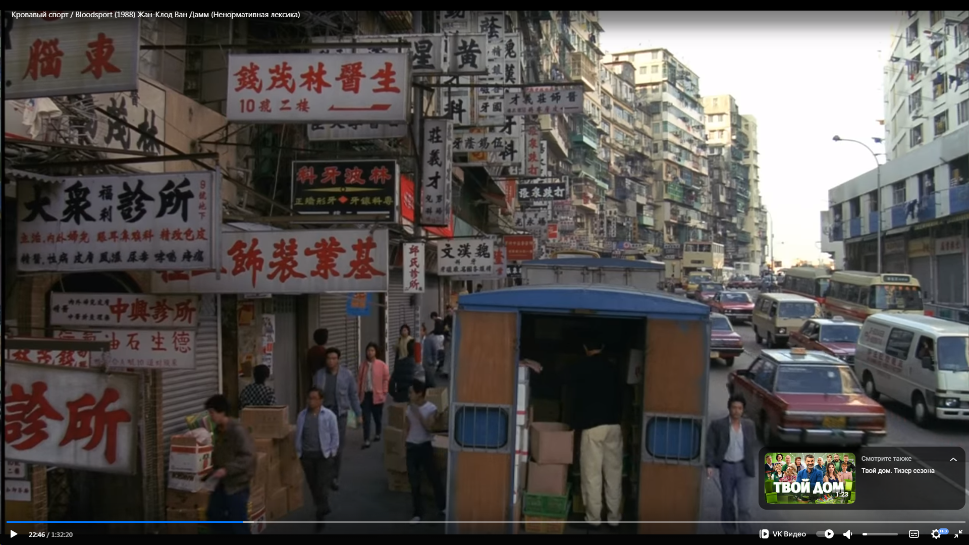 В "Кровавом спорте" (а я прежде всего этот фильм имел в виду) Ван Дамм разок посидел в растяжке в Львином павильоне на пике Виктория с видом на город. Но я охотно верю, что детали этого момента прошли мимо мимо сознания зрителей, завороженных его акробатикой. А вот то, что в основном он шорохался по колоритным трущобам, где и проходили подпольные бои без правил, наверняка врезалось в память хорошо. Поспособствовало обобщённому образу Азии.