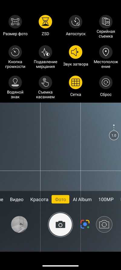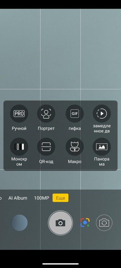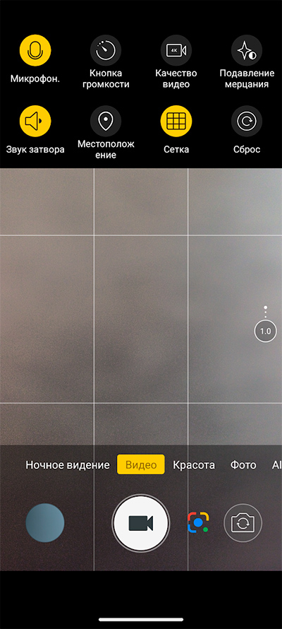 Интерфейс камеры. Снизу переключаются режимы съемки. Сверху - пиктограммы различных переключателей. Также там вызывается дополнительное меню переключателей.